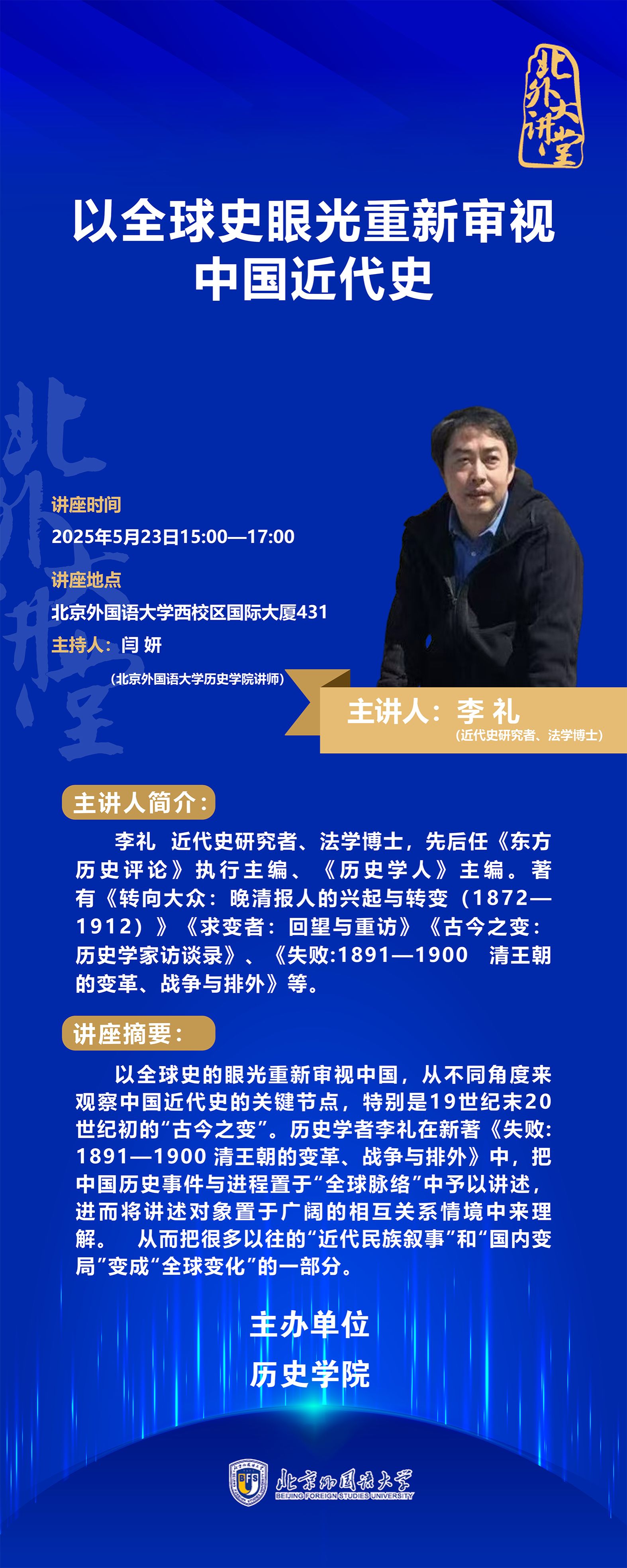 主讲人:李礼 近代史研究者、法学博士,先后任《东方历史评论》执行主编、《历史学人》主编。著有《转向大众:晚清报人的兴起与转变(1872—1912)》《求变者:回望与重访》《古今之变:历史学家访谈录》、《失败:1891—1900 清王朝的变革、战争与排外》等。