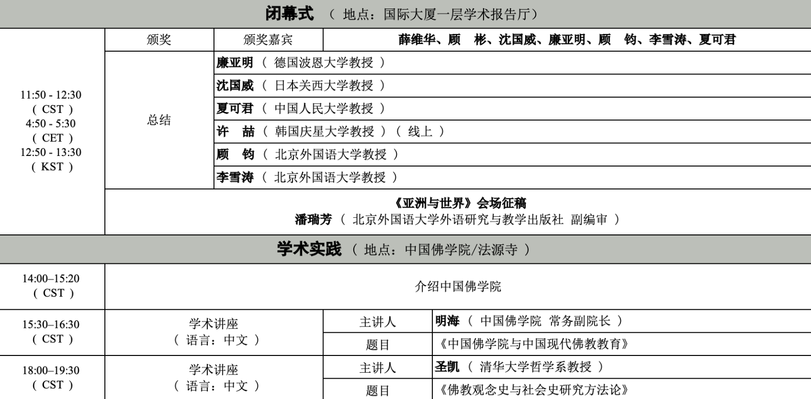 本届论坛将于25日上午在北外西校区国际大厦举行开幕式,由顾彬教授发表主旨演讲。随后各位学者将在25-26日间进行共四场的分论坛讨论。26日论坛闭幕,随后各位学者将前往中国佛学院(法源寺),参加明海法师、圣凯法师主持的学术交流及学术实践活动。论坛具体的日程安排如下: