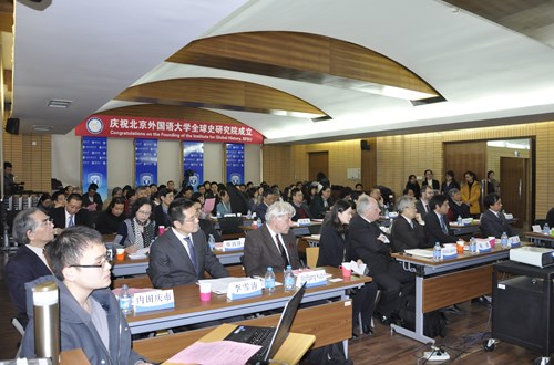 揭牌仪式上, 保加利亚索非亚大学校长伊万· 伊尔切夫、著名汉学家顾彬、日本关西大学图书馆馆长、著名汉学家内田庆市、奥地利维也纳大学孔子学院院长李夏德、德国杜塞尔多夫孔子学院院长培高德、中国科学院自然史研究所所长张柏春、外研社社长蔡剑峰等来自国内外学界业界的专家学者分别致辞。之后,腊碧士教授和李雪涛教授共同作了题为“普通史、世界史、全球史——西方和东方从古至今的观念”的主题报告,阐述了全球史研究的理论框架和具体切入角度,明确了研究院今后的发展方向。在报告中,两位教授首先对历史中的普遍史、世界史和全球史的概念进行了界定。之后对德国哲学家雅斯贝尔斯“轴心时代”的理论以及艾森斯达特的“多元现代性”的概念进行了深入的分析,认为这两个理论可以作为全球史研究院的理论纲领。其后两位教授结合雅斯贝尔斯轴心时代理论、布罗代尔“总体史”中时间观念,提出了“事件历史”、“长期历史”和“轴心历史”三个时间层面的新观点,并认为只有在这一基础之上,才可能研究当今的全球史。