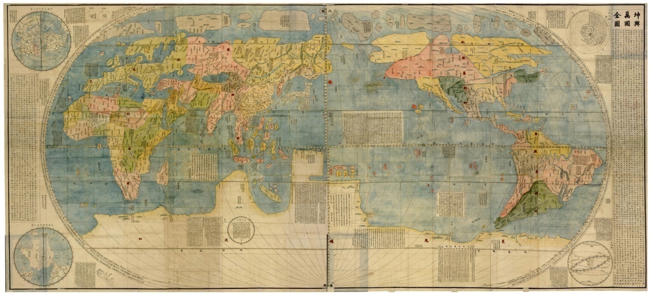 大航海以来,随着欧洲各国的海外扩张及传教活动的展开,近代西方地理知识开始传入东亚地区。利玛窦于1584-1602年间在中国所绘制的多种世界地图,可以说是中国近代意义上的第一种世界地图。由于这一地图是在利玛窦深入研究中国的文献资料以及通过实地考察基础之上,与众多他的中国合作者共同完成的,因此利玛窦世界地图绝不能仅仅被看作是当时西方地图的一个简单翻译,而是中外互动产生的新的成果。由于中国知识分子对地图的理解与当时依然影响巨大的传统天下观密切相关,西方知识的系统很难被纳入传统的知识体系之中,利玛窦的世界地图及与其同时传入的西方地理知识并未在中国知识界产生太大的影响。一些忧心重重的中国知识分子已经认识到了这些异类的知识很可能成为瓦解中国传统知识、思想的契机,因此奋起予以坚决抵制。但该图在传入日本之后,配合着本民族的意识的觉醒却极大地影响了当时日本的世界认知。