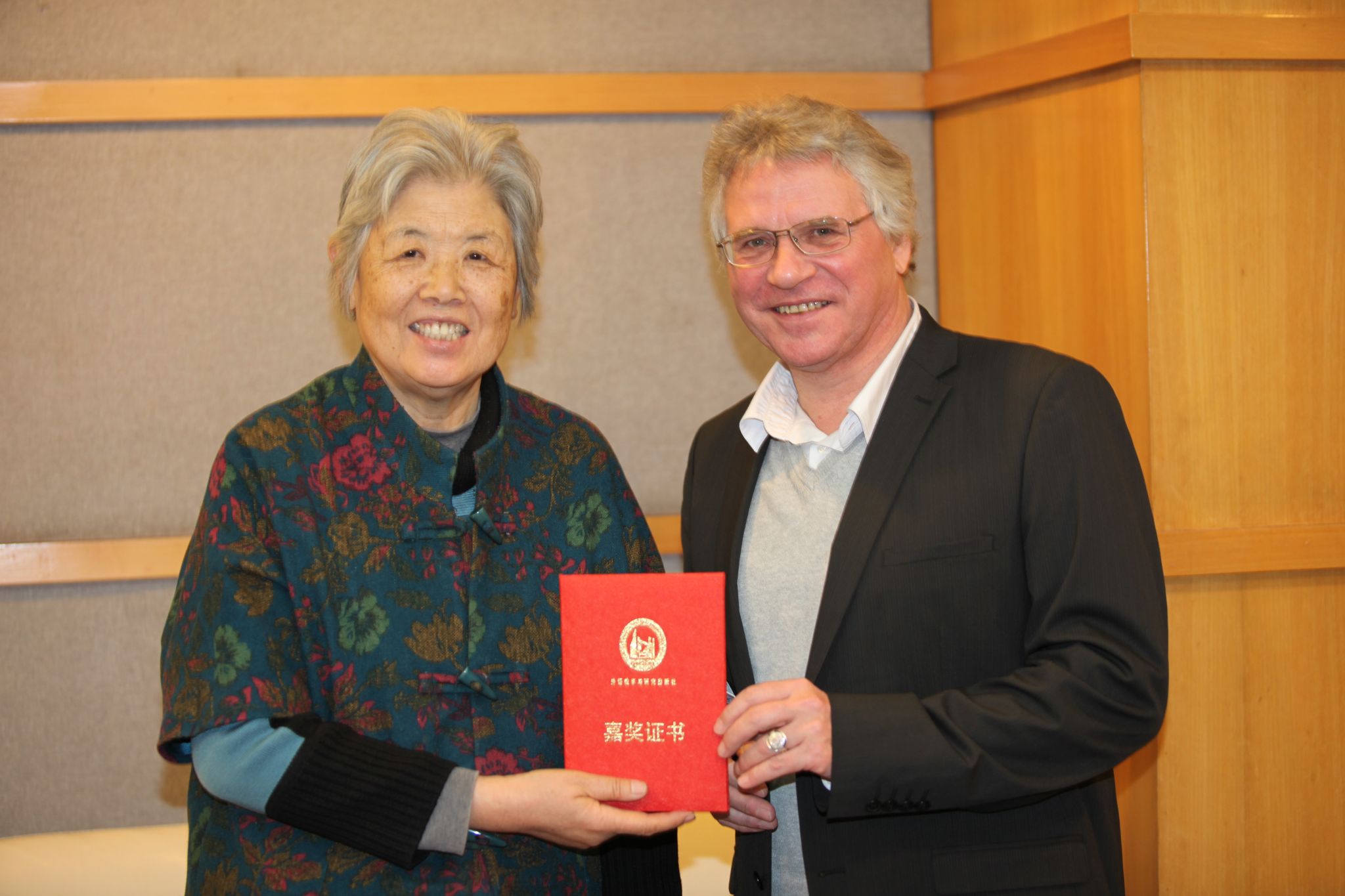 图 2: 2011 年与梁敏教授共同获得颁发给《当代大学德语》的荣誉。